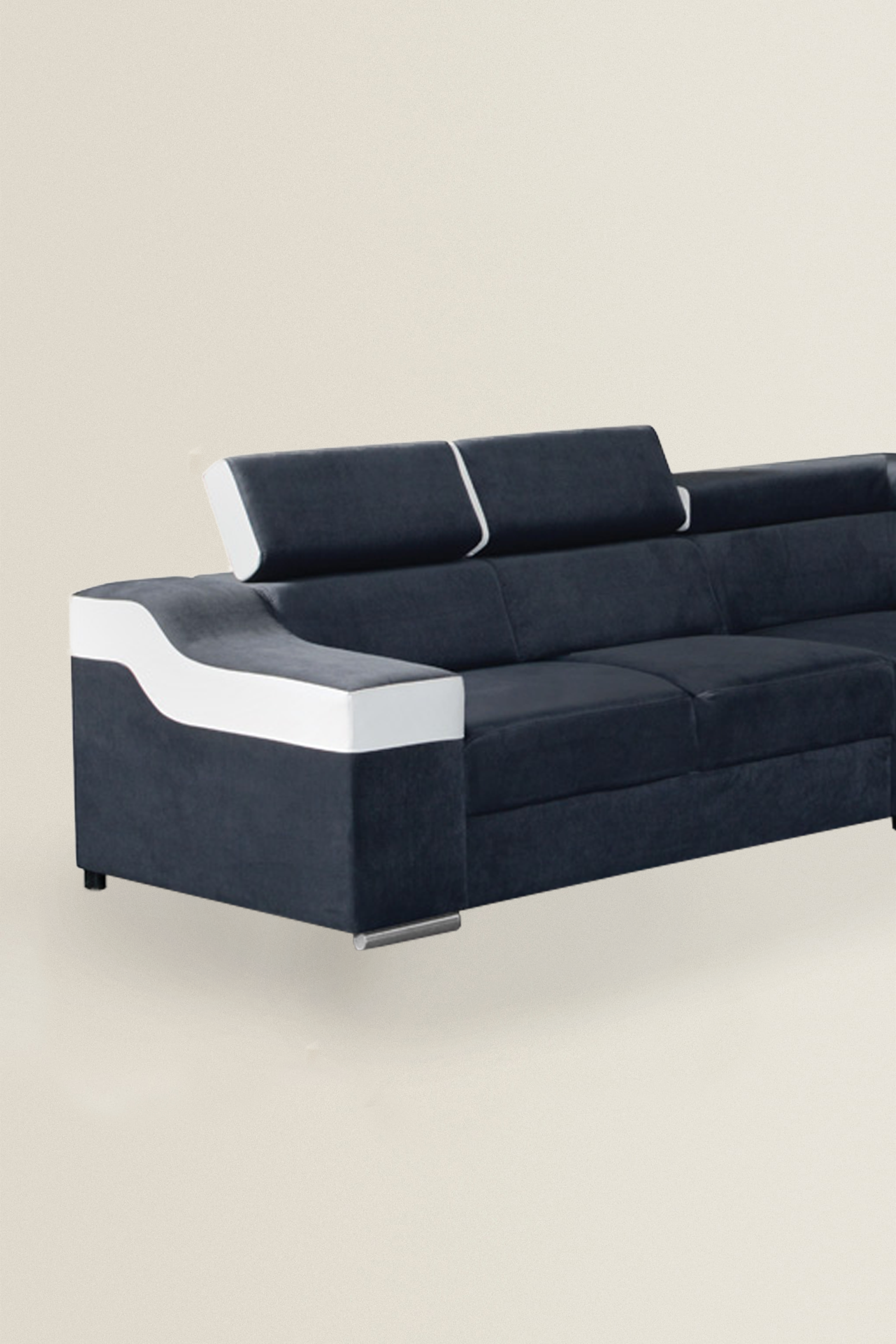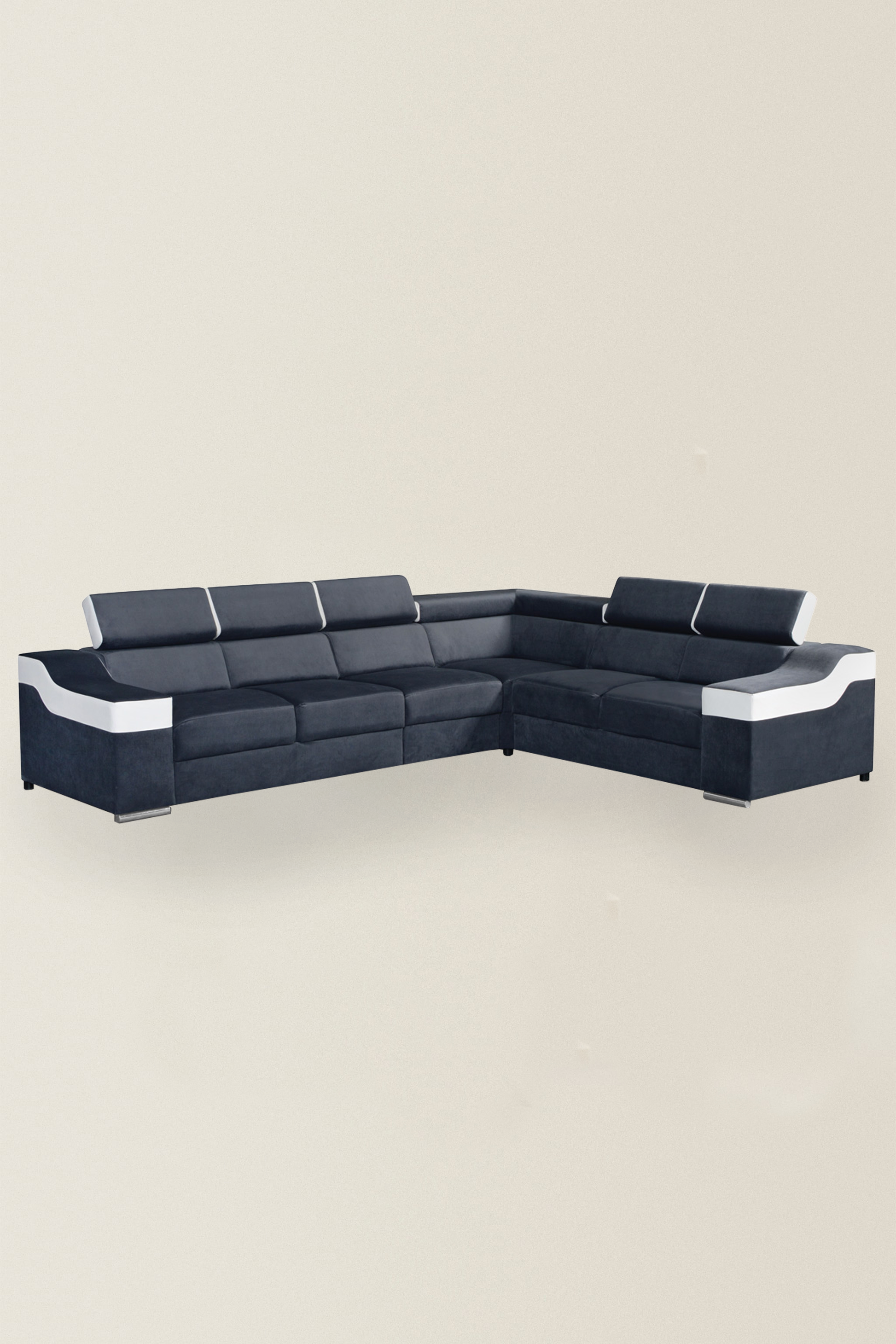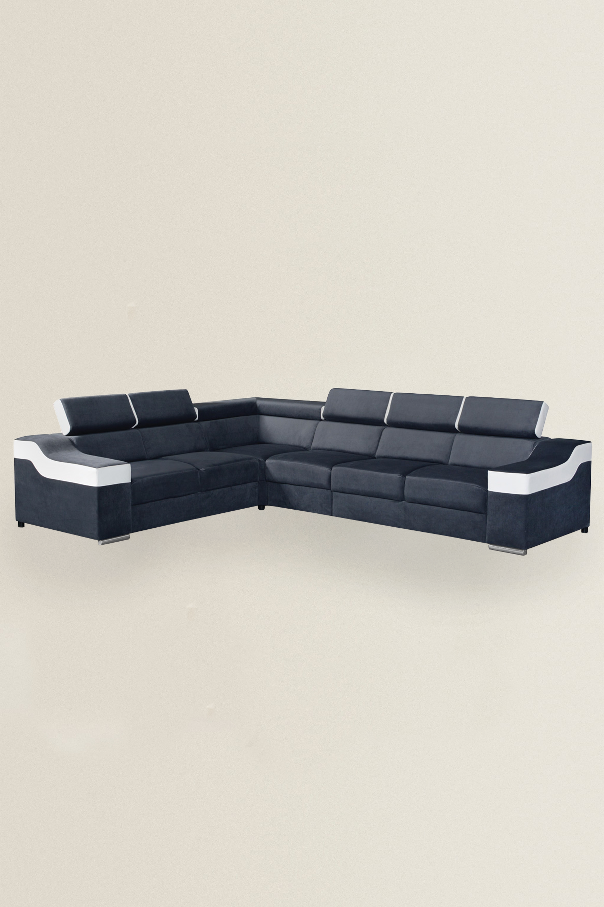 De bekleding bestaat grotendeels uit een stof in donker blauwe graniet kleur (zoals afgebeeld). De randen zijn versierd met witte hoogwaardige kunstleder. De poten van deze hoekbank zijn van metaal en worden los bijgeleverd. Deze zijn eenvoudig te bevestigen.